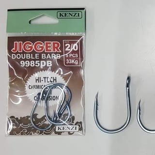 JIGGING HOOK KENZI JIGGER DOUBLE BARB \9985 DB n Available Size : #2/0 (33Kg / Length 3cm / Width 1.6cm / Contents 5pcs) = Rp.40.000. SOLD OUT #3/0 (37Kg / Length 3.5cm / Width 1.8cm / Contents 5pcs) = Rp.40.000. #4/0 (53Kg / Length 3.7cm / Width 1.8cm / Contents 4pcs) = Rp.40.000. #5/0 (55Kg / Length 4.3cm / Width 2.2cm / Contents 4pcs) = Rp.40.000. #6/0 (67.8Kg / Length 4.5cm / Width 2.7cm / Contents 3pcs) = Rp.40.000.