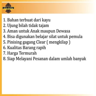 Toy Cleaver Safe for children It can also be used to learn silat beginners Full length of machete +-35cm Toy Cleaver IPSI Cleaver - Material made of wood - The blade tip is not sharp - Safe for children - Can also be used to learn silat beginners - Glossy finish - Quality of neat goods - Full length of machete +-40 cm - Includes the machete and sheath Your Rating Is Very Valuable To Us Thank you if you can give your best rating for our products Who gives me 5 stars and positive values, I pray that he will be given smooth and blessings of his wealth, his body will be healthy, all his affairs will be facilitated and all his wishes will be granted.