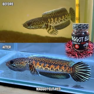 MAGGOT ALL COLOR (FOR ALL COLORS OF CHANNA FISH) 30 GRAMS THE ALL COLOR MAGGOT VARIANT IS A MIXTURE OF RED ELITE MAGGOT AND BLUE ELITE MAGGOT, SO THE DOSE IS FAST FOR YOUR FISH USES: - FOR CHANNA AURANTI ORANGE AND BLUE BARS ON THE DORSAL - FOR CHANNA MARU INCREASE THE COLOR AND BLACKEN/BATIKIN THE DORSAL MARU. - FOR LIMBATA, ANDRAO, STEWARTI JUST USE IT (ALL COLOR SHRIMP IF MAGGOT IS MORE AUERRANTI AND MARU) BUT IF YOU WANT TO INCREASE ALL COLORS AND QUICKLY BIG THE FISH I RECOMMEND MAGGOT ELITE (QUICK MAGGOT FOR BIG FISH) WARNING : THE PIGMENT THAT WE USE IS THE BEST MATERIAL WITHOUT SAVING THE MATERIAL (SLIGHTLY OVERFLOWING WHEN IT ENTERS THE WATER/RED PIGMENT UNTIL IT COMES OUT). ADVICE TO FEED EVERY DAY 2 TIMES A LITTLE OR ONCE BUT A BIT HOW TO USE : FEED EVERY DAY ( DIKIT) AND AVOID EXCESS FEED ( CAN BE FAT) SIZE OF CHANNA AND AMOUNT OF FEED 2 TIMES A DAY 10 - 15 CM = ENOUGH 2-3 MAGGOT 15 - 30 CM = ENOUGH 4-6 MAGGOTS 30 - 50 CM = ENOUGH 7-10 MAGGOT THANK YOU FOR BUYING THE BOSS MAGGOT FEED... SUCCESS IS ALWAYS MY BOSS