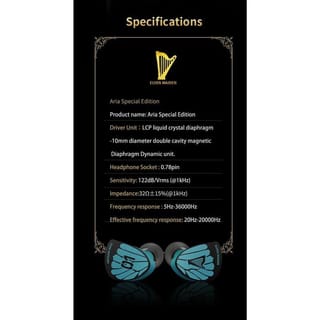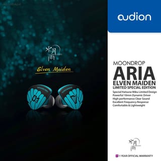 ◎PIECE READY ◎1 YEAR WARRANTY ◎100% NEW & ORIGINAL PRODUCTS === Moondrop Aria Elven Maiden – Limited Edition with Artistic Design and High-Quality Sound Charming New Design Aria Elven Maiden's moondrop comes with a stunning new look. Carrying the theme "Wings & Harp", the faceplate is designed in elegant shades of turquoise blue and black doff. These visuals give it an artistic touch that sets it apart from the regular version, making it an excellent choice for audio lovers who also appreciate aesthetics. 10mm LCP Driver with Dual Magnetic Cavity Despite coming with a new look, the technical configuration still maintains the successful formula of the original Aria. The 10mm dynamic driver with LCP (Liquid Crystal Polymer) diaphragm and dual-magnetic cavity structure ensures clear, natural, and responsive sound across the entire frequency spectrum. Precision Tuning Based on HRTF Moondrop tunes the Aria Elven Maiden according to the HRTF (Head-Related Transfer Function) frequency curve and the Room Response Function, resulting in a realistic and expansive listening experience. The voice characters sound alive with airy staging, suitable for a wide range of music genres. High Quality Coated Silver Cable Featuring a built-in cable with a silver-plated oxygen-free copper core and a braided nylon outer shield, the Aria Elven Maiden ensures clean and durable signal transmission. The cable is also flexible and strong for long-term use. Technical Specifications Driver: Dynamic 10mm Dual-Magnetic Cavity Diaphragm: Liquid Crystal Polymer (LCP) Tuning: Head-Related Transfer Function & Room Response Cable: Silver-Plated, Braided Nylon, 0.78mm 2-pin Plug: 3.5mm gold-plated Package Contents Moondrop Aria Elven Maiden IEM Silver-plated cable Silicone eartips (various sizes) User manual Warranty card