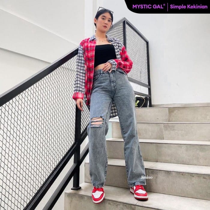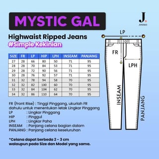 ! HIGHWAIST LOOSE RIPPED - MYSTIC GAL #SimpleKekinianBahan: Non-Stretch (Not Stretched)Pants Model: Highwaist Ripped JeansThe writing tape can be pulled outJeans Iconic 90s from JINISO is indeed a very best seller! waist High Waist (above the waist) with a wide bottom that will make you cool all day and #SimpleKekinianSize 27 - 30, outer side length: 95 cm, inner side length: 71 cmSize 31 - 34, outer side length: 95 cm, inner side length: 70 cm27= Front Rise: 28 cm x Waist Width: 66 cm x Pants Length: 95 cm28= Front Rise: 28 cm x Waist Width: 70 cm x Pants Length: 95 cm29= Front Rise: 28 cm x Waist Width: 72 cm x Pants Length: 95 cm30= Front Rise: 28 cm x Waist Width: 76 cm x Pants Length: 95 cm31= Front Rise: 32 cm x Waist Width: 78 cm x Pants Length: 95 cm32= Front Rise: 32 cm x Waist Width: 82 cm x Pants Length: 95 cm33= Front Rise: 32 cm x Waist Width: 84 cm x Pants Length: 95 cm34= Front Rise: 32 cm x Waist Width: 86 cm x Pants Length: 95 cmInfo:* (professional photoshoot and endorsement, It is forbidden to steal photos belonging to the JINISO brand)** All sizes can be different 1 - 3 cm as mass-produced*** The colors in the photo can be different from the physical depending on the screen display settingsIMPORTANT! Complaints are not acceptable if there is no unboxing video (No Pause & showing the part of the complaint)#jiniso #highwaistloose #highwaistjeans #loosejeans #jeanswanita #jeanshw #lokalbrand