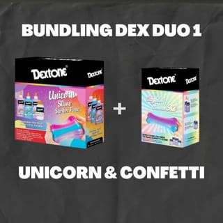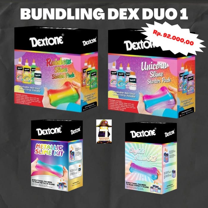 Bundling 2 packages..... Unicorn / Rainbow + Confetti / Metallic Package Hi guys, Please check it out immediately. Stock is definitely ready. And we still try hard to send kk orders on the same day. For S & There is a separate explanation on the photo product page. * For the packaging. Our standard is bubble wrap / custom box packaging customized wg the number of family orders. And if the packaging is good, the sons and daughters of KKK will be happy. * For those who are still unsure about the right way to mix, you can check on our youtube. Just click on the desired items. * For guys who like free shipping, you can check out one or a combination of 2 items of slimes (1 item 1 kg, 2 items 2 kg) Maximum freeong requirement is 2.2 kg. Still in 2 items. lt; lt; lt; lt; lt; Happy shopping gt; gt; gt; gt; The Dextone Slime Kit consists of transparent art and glue, confetti activator and a recipe for making slime. Can be used for crafting, playing or schoolwork. Non-toxic and easy to wash, very safe for children. Once it is Slime, it can be reused by placing it in a tight container and stored in the refrigerator so that it does not dry out. Dried slime can no longer be used. Set Details : Confetti slime kit : 1 bottle art and craf glue blue 147 ml 1 bottle art and craf glue purple 147 ml 1 bottle blue confetti activator 88 ml 1 bottle purple confetti activator 88 ml 1 recipe to make slime Red and Blue Metallic Slime Kit : 1 bottle red metallic glue 147 ml 1 bottle blue metallic glue 147 ml 2 bottle magical liquid 68 ml 1 recipe to make slime Glow in the Dark Blue Slime kit: 1 bottle blue glow in the dark 147 ml 1 bottle transparent glow in the dark 147 ml 2 bottle magical liquid 68 ml 1 recipe to make slime Glow in the Dark Pink Slime kit: 1 bottle pink glow in the dark 147 ml 1 bottle transparent glow in the dark 147 ml 2 bottle magical liquid 68 ml 1 recipe for making slime Unicorn slime starter pack : 1 bottle pink glitter glue 177 ml 1 bottle blue glitter glue 177 ml 1 bottle purppl