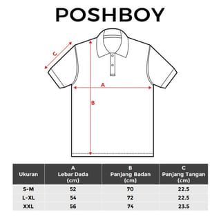 POSHBOY Est. 1989 - Modern Classic Edition --------------------------------------------------------------------------- Original Poshboy brand men's basic polo shirt. Product Details • Material: Pique (35% polyester, 65% cotton) • Cutting : regular/muscle fit • Color : black/white/light grey/navy blue/light green/khaki • Collar, cuffs, 2 front buttons Material Details • Comfortable to wear, slightly stretch and non-transparent • Material thickness : medium (200 gsm) Size Guide Chest Width x Body Length x Arm Length S-M ( 52cm x 70cm x 22.5cm ) L-XL ( 54cm x 72cm x 22.5cm ) XXL ( 56cm x 74cm x 23.5cm ) *Model height 180cm using size L-XL Follow the Poshboy Official store to get the latest info and promos from us. Thank you!