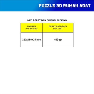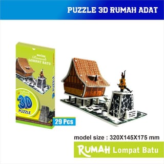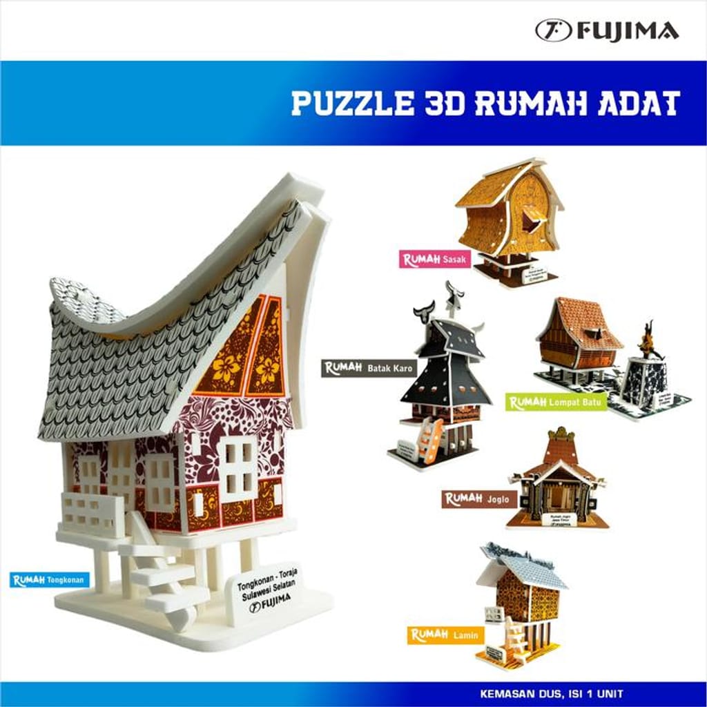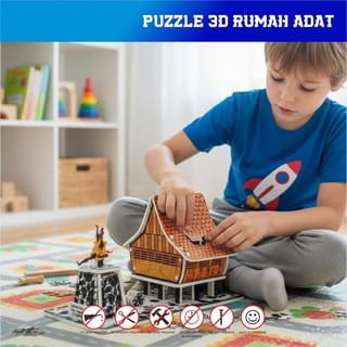 FUJIMA PUZZLE 3D CUSTOM HOUSE Play while learning? Absolutely! Fujima's 3D puzzle is not just a game, but also an educational medium to introduce Indonesian culture from an early age Specially designed for children aged 3 years and above, this puzzle helps the brain and motor development of your little one. Product Advantages ️ Soft and child-safe sponge material ️ Easy to assemble & play SNI Certified Educational media for Indonesian culture Train children's patience Develop cognitive skills Practice eye and hand coordination Honing problem solving skills Develop fine motor skills Benefits of Education By playing this puzzle, children can: Get to know the various Indonesian traditional houses Practice logic & concentration Improves memory Learn while playing in a fun way Product Specifications Brand : Fujima Material: Padded sponge Age : 3+ Years Standard : SNI Choice of Traditional House Various models available: Sasak House A Village with a Garden Joglo House Rock Jumping House Lamin House Tongkonan House Fun + educational play in one product! Let's help your little one be more creative while getting to know Indonesian ️ culture Happy Shopping