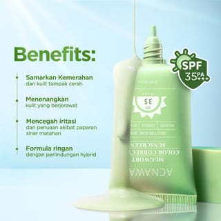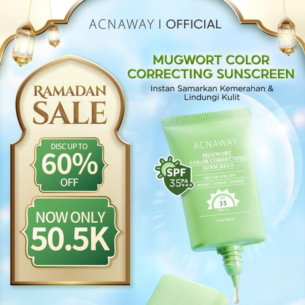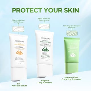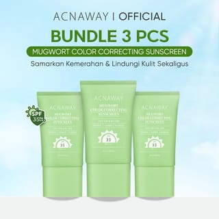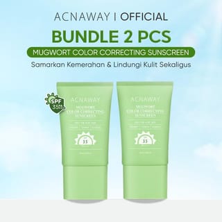 ACNAWAY Mugwort Color Correcting Sunscreen Net: 30 ml BPOM No: NA11251700069 A 2-in-1 hybrid sunscreen that not only protects the skin from UVA and UVB rays, but also provides an instant cover effect with green color changing technology that helps disguise redness on acne-prone and sensitive faces. Formulated with Mugwort, Ceramide, and Bisabolol that soothe, moisturize, and keep the skin barrier healthy. The texture is lightweight, easily absorbed, without alcohol and perfume, making it comfortable to use every day even for sensitive skin. BENEFITS Protects skin with SPF 35 PA+++ from UVA & UVB rays. Disguises reddish skin instantly with color correcting tone-up. Helps relieve irritation and soothe acne-prone skin. Prevents signs of premature aging due to sun exposure. Maintain moisture and strengthen the skin barrier with Mugwort + Ceramide + Bisabolol. Provides a natural finish without whitecast, safe for acne-prone skin. HOW TO USE Use after the moisturizing stage in the morning. Apply sunscreen with 2 fingers evenly on the face and neck. Reapply every 2 hours, especially after sweating, swimming, or outdoor activities. For maximum results, use it regularly as the last step of skincare before makeup. INGREDIENTS Mugwort Extract Ceramide NP Bisabolol Full Ingredients: Aqua, Glycerin, Titanium Dioxide, Propylene Glycol, Ethylhexyl Salicylate, Cyclopentasiloxane, PEG-8 Dimethicone, Butyl Methoxydibenzoylmethane, Homosalate, CI 77492, Dimethicone/Vinyl Dimethicone Crosspolymer, Aloe Barbadensis Leaf Extract, Panthenol, Bisabolol, Centella Asiatica Root Extract, Ceramide NP, Artemisia Vulgaris Extract, Calendula Officinalis Flower Extract, Chrysanthellum Indicum Extract, etc