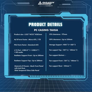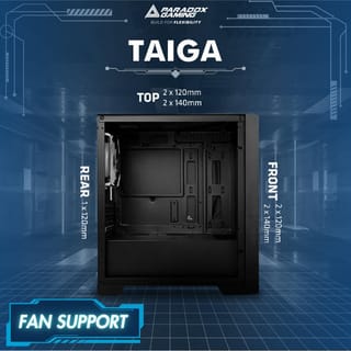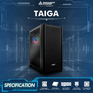 CASSING PARADOX GAMING TAIGA V2 | MESH BLACK | M-ATX | 1X AUTO RGB FAN SPECIFICATION: - CASE DIMENSION: '365*216*405mm - PACKAGE DIMENSION: 463*276*429mm - WEIGHT : 4.95 KG - SIDE PANEL: SLIDING TEMPERED GLASS - M/B TYPE: MICRO ATX, MINI ITX - I/O: '2x USB3.0+ 1x USB2.0 + HD AUDIO - SLOT EXPANSION: 4 - LED STRIPS : - - GPU MAX: 330mm - CPU MAX: 170mm -PSU:- DRIVE BAY : - 3'5 : 2 - 2'5 : 2 - 5'25 : - SLOT BONUSES: - FRONT: 2 x 120mm / 2 x 140mm - TOP: '2 x 120mm / 2 x 140mm - REAR : PREINSTALED 1 x 120mm ARGB FAN -SIDE:- -BOTTOM:- "PSU : NOT INCLUDED" FOR CLAIMS, IT IS MANDATORY TO INCLUDE UNBOXING VIDEOS WITHOUT CROPPING PLEASE BE CAREFUL BEFORE PURCHASING, ITEMS THAT HAVE ALREADY BEEN PURCHASED CANNOT BE EXCHANGED OR RETURNED