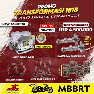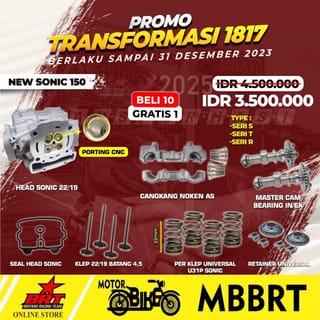 HEAD PACKAGE + NOKEN AS + BEARING + PER KLEP + CARBON COIL + SEAL HEAD ORIGINAL BRT For Motorcycle : SONIC New / CBR 150 / CB 150R / SUPRA GTR Completeness: 1. HEAD BRT PORTING CNC 22/19 OR 24/22 2. 1 Set of 4.5mm Carbon Stem Valves 3. Master Cam / Noken As + Bearing 4. Seal Head 5. 1 Set Per Valve