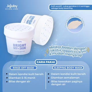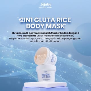Gluta Rice Milk Mask The first body mask in Indonesia that comes with "6 hero ingredients": 1. Glutathione : Brightens the skin, helps skin regeneration 2. AHA: Exfoliates dead skin cells 3. Niacinamide: Brightens and fades dark spots on the skin 4. Panthenol : Relieves redness / irritation 5. Rice extract: Brightens and overcomes skin spots 6. Goat milk : Moisturizes and smoothes the skin HOW TO USE (2in1) As a RINSE OFF BODY MASK 1. Before bathing, apply a thick layer of jejuby all over the body 2. Let stand 5-15 minutes 3. Rinse with water As a SLEEPING BODY MASK 1. After bathing, apply a thin layer of jejuby all over the body 2. Leave it overnight 3. Rinse the next morning with water For maximum results, use it during the afternoon shower as bleaching and at night before going to bed as a mask. WEARING AREA Safe to use for the neck down area, including crease and slender areas Avoid face and sensitive areas Safe to use for BUMIL, BUSUI and age 10 years and above BPOM No: NA18230200948