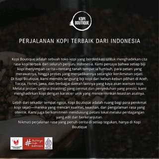 > 100% premium quality Arabica coffee beans > Coffee is available in the form of roasted beans with a medium profile > If desired can be grinded as needed: Rough, Medium or Fine Note: If there is no special order, we will send it in seed form Many other coffee options in https://www.tokopedia.com/kopi-boutique