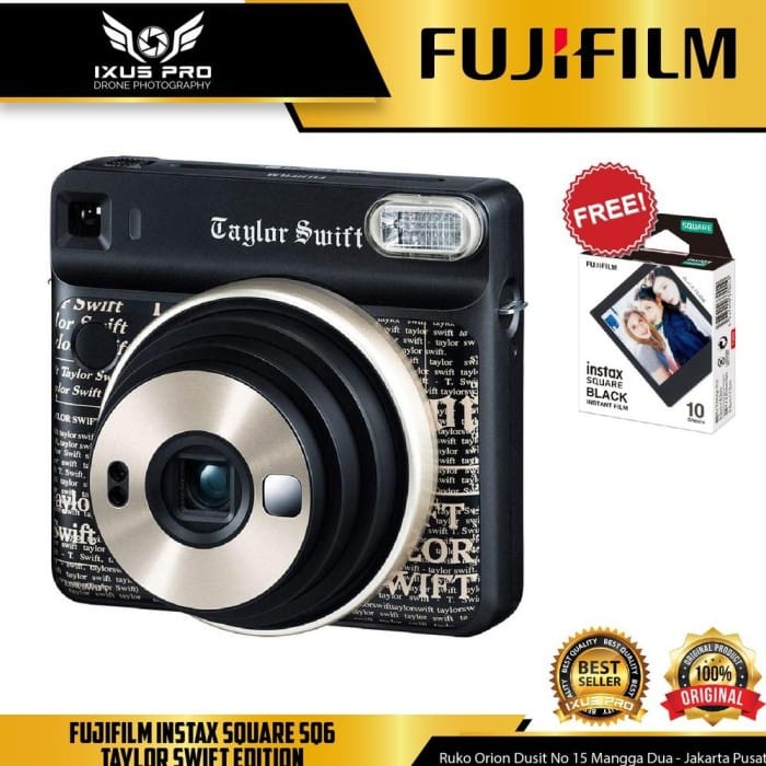 =========================================== 1 YEAR OFFICIAL WARRANTY PT. FUJIFILM INDONESIA =========================================== FREE : PAPER INSTAX SQUARE BLACK FRAME Key Features : - Accepts INSTAX SQUARE Instant Film - Produces 2.4 x 2.4" Square Images - Fujinon 65.75mm f/12.6 Lens - Optical Viewfinder with Target Spot Optics : - Focal Length: 65.75mm - Aperture: f/12.6 - Focus Type : Zone Focus - Minimum Focus Distance : 11.81" / 30 cm Viewfinder/Display : - Viewfinder Type : Optical - Viewfinder magnification: approx. 0.4x Exposure Control : - Exposure Modes : Automatic - Shutter Speed : 1.6 to 1/400 Sec - Exposure Compensation : -0.6 to 0.6 EV (in 2/3 EV Steps) - Self-Timer: 10 Sec Flash: - Built-In Flash : Yes - Effective Flash Range : 0.98 to 8.86' / 0.3 to 2.7 m - Flash Modes : Auto - Recycle Time : 0.2 to 7 Sec () Inspired by her album, reputation, the INSTAX SQUARE SQ6 Taylor Swift Edition is a stylish take on FUJIFILM's square-format instant film camera. This special edition camera features a gold-colored newspaper print, similar to the artwork from her album, along with a metallic ring around the lens and a faithful reproduction of her autograph on the back of the camera. Additionally, this edition comes with a Taylor Swift camera strap and film case. The first analog camera to accept INSTAX SQUARE film, the SQ6 is a simple and fun instant film camera that produces 2.4 x 2.4" square prints. The camera's sleek and stylish design incorporates a Fujinon 65.75mm f/12.6 lens, which offers a three zone focus design, with a Minimum focusing distance of 11.8". A small selfie mirror is built into the front of the lens design for accurately composing self-portraits and a dedicated Selfie Mode can be used to optimize focus and exposure. The camera's design also features an optical viewfinder with a central target spot for accurately composing images. A built-in flash is also featured, for illuminating scenes in low-light, and three colored flash