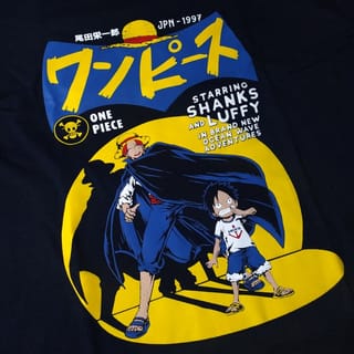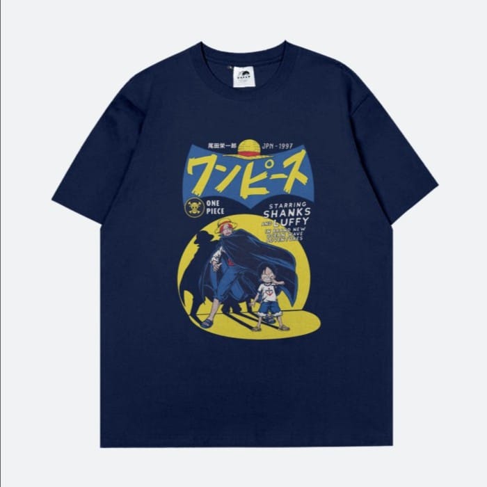One Piece Anime Series. Shanks and Luffy Try to package the One piece anime with a vintage and anti-mainstream feel. we took the concept from the Batman comic cover amp; Phenomenal Robin, with shanks replacing the Batman figure and Luffy as his loyal fans replacing the Robin figure __ Product Summary : • Graphic T-Shirt • 100% Cotton, Sweat absorbing and soft handsfeel • Combed 30 #39; s with a gramation of 150 gsm • Navy Blue Color • Regular Fit with Chain Sewing on the shoulder • Round collar with collar width +- 2 cm • Plastisol screen printing, Durable, smooth and not easy to fade/break ___ • Size guide is on the last slide of the photo • The size available according to the product variety. • T-Shirt and Screen Printing color 90% as original due to lighting and camera factors during photo sessions • Delivery schedule every Monday-Saturday at 19.00 WIB or D+1 max at 12.00 WIB after the order is received ___ Don't hesitate to ask about product information and orders, - Thank you for supporting our small business -