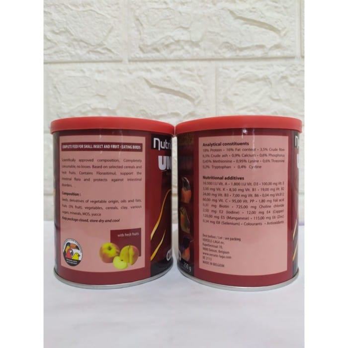 NUTRIBIRD UNI VERSELE-LAGA feed for ocean birds Magpie kacer pleci tledekan finc VERSELE-MATCH MADE IN BELGIUM NET: 250GRAMS USAGE:FOOD OF FRUIT-EATING BIRDS & INSECTS LIKE PLECI ETC Maintenance of food for fruit-eating birds and small insects such as pleci, ciblek, branjangan and the like The composition is needed together with all the nutrients your bird needs. Completely depleted, no food waste. Based on the selected grains and fruits. Contains Florastimul: supports the intestinal flora and protects against intestinal disorders. By veterinarians and used worldwide by garden ornithologists and top breeders. Instructions for use Free, combined with fresh fruit and / or live food. Analytical constituents Protein 18% Fat content 16% Crude fiber 3.50% Raw ash 6.50% Calcium 0.90% Phosphorus 0.60% Lysine 0.95% Methionine 0.45% Cystine 0.40% Threonine 0.60% Tryptophan 0.20% Nutritional additives Vitamin A 16,500 IU / kg Vitamin D3 1,800 IU / kg Vitamin E 100 mg / kg Vitamin K 3.50 mg / kg Vitamin B1 8.50 mg / kg Vitamin B2 19 mg / kg Vitamin B3 24 mg / kg Vitamin B6 7 mg / kg Vitamin B12 0.04 mg / kg Vitamin C 60 mg / kg Vitamin PP 95 mg / kg Folic acid 1.80 mg / kg Biotin 0.31 mg / kg Choline Chloride 725 mg/kg E2 (iodine) 2.50 mg / kg E4 (copper) 12 mg / kg E5 (manganese) 120 mg / kg E6 (zinc) 115 mg / kg E8 (selenium) 0.34 mg / kg Colourant(s) Antioxidant Preservatives Composition Cereal Seed Fruit (min 5% fresh fruit) Vegetable protein extracts Derivatives of vegetable origin Sugar Mineral L-Lysine Methionine Extra Yucca schidigera Extra Tagetes spp. Fructo-oligosaccharides Vitamin