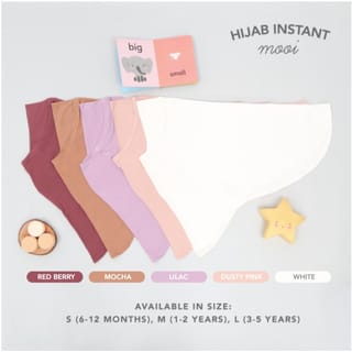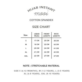 Mooi Hijab Instant - Material: Cotton Spandex - Soft and breathable, perfect for daily wear - Soft elastic material, comfortable even for baby (DO NOT MAKE AGE AS A BENCHMARK SIZE, PLEASE MEASURE IT TO CHILDREN MASING2 BECAUSE EVERY CHILD IS DIFFERENT) SIZE TOLERANCE +- 1 CM The color of the original product may be slightly different from the photo, due to different HP or computer screen effects. Please pay attention to the detail size, and please understand for seam size tolerance +/- (1-2cm) because the entire production process all use human resources.