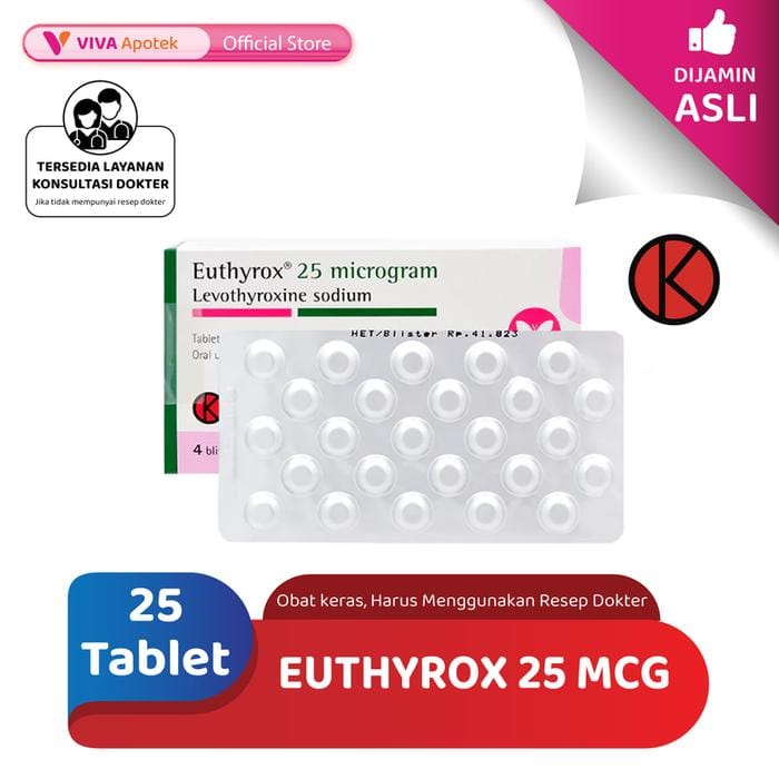 Euthyrox 25 mcg for the treatment of euthyroid goiter, prevention of recurrence after strumectomy, hypothyroidism, for combination therapy with antithyroid, total post-thyroidectomy and thyroid suppression test General Indications: For the treatment of euthyroid goiter, prevention of recurrence after strumectomy, hypothyroidism, for combination therapy with antithyroid, total post-thyridectomy and thyroid suppression tests. Composition: Each tablet contains levothyroxine sodium Dosage: Euthyroid goiter: For adults 75-200 mcg is given and for adolescents 50-150 mcg is given. Prevention of recurrence after strumectomy: 75-200 mcg. Hypothyroid: For adult patients, an initial dose of 25-50 mcg is given and an increase of 25-50 mcg at intervals of 2-4 weeks Rules of Use: For oral use, take a daily single dose in the morning on an empty stomach (at least half an hour before breakfast) Attention: Diabetes, high blood pressure, heart failure, hypothyroidism Side Effects: Possible side effects are irregular or rapid heartbeat, chest pain, headache, muscle weakness or cramps, redness and warmth of the face, fever, vomiting, menstrual disturbances, tremors, restlessness and weight loss. Product Class: Hard Medicine (Red) Packaging: Strip @ 25 Tablets Manufacturing: Merck Registration No.: BPOM RI : DKI 2363401910C1