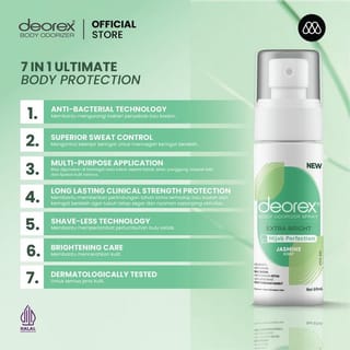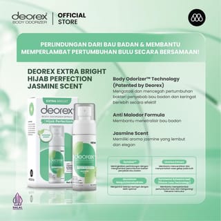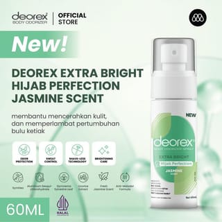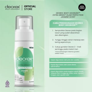 Pre-Order Benefit During the pre-order period, every purchase will be immediately accompanied by 1 mini size of Deorex. Mini size will be shipped automatically with the order, without the need for a separate add to cart. Especially on February 22 - 24 NEW Deorex Body Odorizer Extra Bright Hijab Perfection Jasmine Scent Comes with 4-in-1 Advanced Care: Protects against body odor Helps control sweating Helps brighten skin Slows down hair growth Specially formulated with SymDeo and Aluminum, Sesquichlorohydrate, provides more optimal protection, against body odor and excessive sweating for up to 72 hours. Enriched with Licorice extract that helps brighten and disguise dark areas on the skin. Gymnema Sylvestre Leaf Extract works as an active ingredient in Shave-Less technology that helps slow down hair growth and provides a smoother feel for longer without the need for frequent shaving. The alcohol-free formula makes this product gentle and safe, even for sensitive skin and hijab-wearing users. With the Anti-Malodor Formula, this variant is able to neutralize pungent odors instantly. This variant comes with a soft and elegant scent of jasmine flowers. Ingridients: Aqua, Propylene Glycol, Aluminum Sesquichlorohydrate, Alcohol, Fragrance, PEG-40 Hydrogenated Castor Oil, Glycyrrhiza Glabra (Root) Extract, 2-Methyl 5-Cyclohexypentanol, Gymnema Sylvestre Leaf Extract, Pentylene Glycol, Menthol, Glycerin, Menthyl Lactate, Caprylyl Glycol, Tetrasodium EDTA, Phenoxyethanol, Sodium Hydroxide BPOM No: NA18250901424