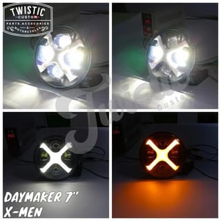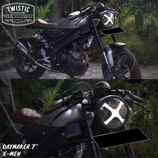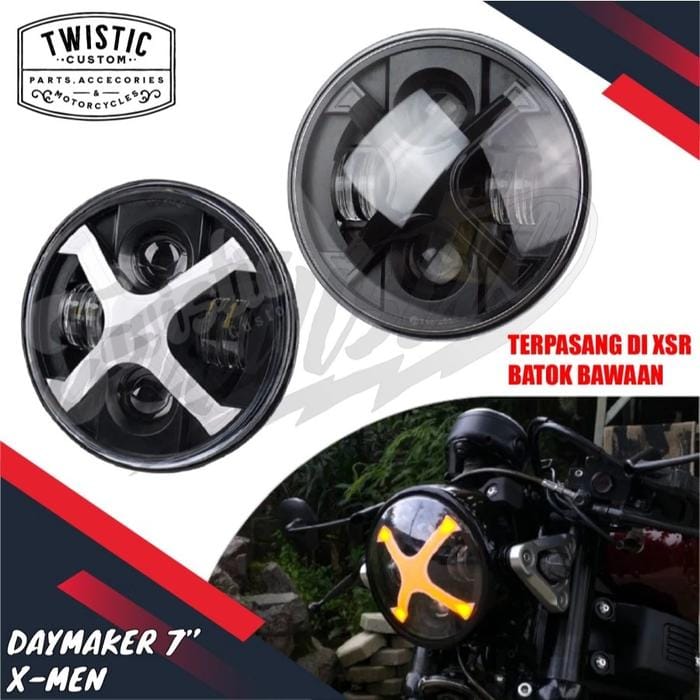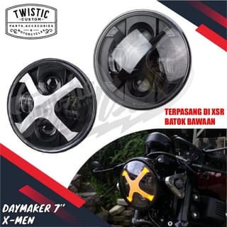 LED Projector Reflector Daymaker model X-MEN 7 inch ORIGINAL Items. The price is cheap because it takes a reasonable profit. SUPER BRIGHT QUALITY. Quality is unquestionable. Price above unit / 1pcs LED Projector lights are equipped with DRLs (Twilight Lights) suitable for Harley Davidson, Triumph, Kawasaki W175, Honda CB, Suzuki, Yamaha, Custom Motorcycles, Classic Motorcycles, Jeeps, Wranglers. Daymaker installation is required to use 12V/24V DC current, which can be taken from the battery source / socket that is full wave. If using AC current or from Spull Motor, there will be a risk of the daymaker breaking/dimming/not turning on (we are not responsible for human error in this case). For the claim and return process, it is mandatory to include an unboxing video and then test using the battery. If the Daymaker does not turn on then we will replace it with a new unit. Before being sent, we will test the unit first using a power supply so that it is received in good condition. The difference between the White X and Smoke X variants is in the mica section of the X lamp where: - White X uses clear mica the position of the headlamp is not on, the X light is still clearly visible. - Smoke X uses mica smoke, the position of the headlamp is not turned on, the X light looks faint. - Both of these variants can use yellow and white colors for the X lamp (the cable of each color is available). Specifications: - Power: 50W - Certificates: CE,ROHS,IP67,DOT,E-Mark - Long life: 50000 hours - Lumens: 5000lms - Beam : High Beam & Low Beam - Waterproof: IP 67 - Color Temperature: 6000K-6500K - Voltage: DC 12V~30V - Material: Die-cast aluminum housing, clear hardcoated PC lens Equipment : 1 x 7" LED Daymaker model X-MEN FOR ELECTRONIC ITEMS SUCH AS HEADLAMPS, PENNY STOPLAMPS, FOGLAMPS, DAYMAKERS ETC IT IS REQUIRED TO RECORD TEST VIDEOS WITHOUT PAUSE USING 12V BATTERY We do not accept any complaints about items that have been installed / connected to the motor body cable or the condition has been installed on the motorcycle and Order / Transaction status completed. We have checked the goods before they are sent, if they are still returned, we will appeal by attaching proof of checking the goods on CCTV.