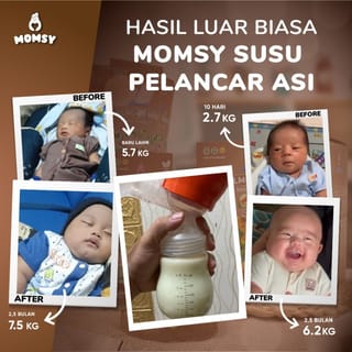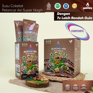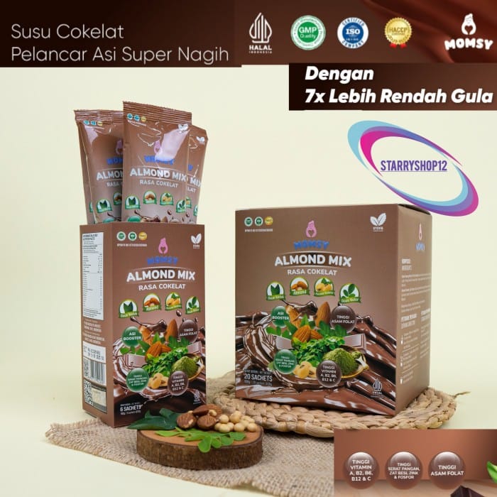 CONTENTS 6 and 20 SACHETS Breast Milk Booster with 4 breastfeeding ingredients at once which can help pregnant women or breastfeeding increase breast milk production and fulfill nutrition for mothers and babies. (Almonds, Soybeans, Cabbage Leaves, Moringa Leaves) MOMSY ALMOND MIX CHOCOLATE FLAVOR. BPOM RI MD 8305 3183 5367 HALAL ID00410000262430921 Sugar Content : 1gr/sachet With Natural Sweetener Stevia! Utilizing 4 NATURAL INGREDIENTS AT ONCE that have been clinically tested, Low Sugar, High in Vitamins and Minerals along with Folic Acid, Calcium, Iron, Zinc & Phosphorus. The contents of MOMSY ALMOND MIX CHOCOLATE FLAVOR are: Almond Moringa Leaves Katuk Leaf Soybeans THE ADVANTAGES OF MOMSY ALMOND MIX WITH CHOCOLATE FLAVOR. Katuk leaves are high in lactagogum and prolactin which can help trigger more breast milk production and facilitate mommy breast milk production. Soybeans are useful for increasing the production of phytoestrogen hormones for breastfeeding mothers which can help increase mommy's milk production. Moringa leaves are useful for increasing Prolactin levels which can increase milk production, strengthen the immunity of mothers and babies and prevent anemia Almonds are beneficial for breastfeeding mothers so they can be used as a galachagog. Contains Fiber, Protein, Vitamin E, Calcium and Folic Acid which is good for breastfeeding mothers. As well as containing unsaturated fats that can increase breast milk density THE BENEFITS OF MOMSY ALMOND MIX WITH CHOCOLATE FLAVOR. > Helps to improve QUALITY & QUANTITY OF BREAST MILK > Nutritional Fulfillment for Mommy and Liver (High in Folic Acid, High in Vitamin A, B2, B6, B12 & C, High in Dietary Fiber, Iron, Zinc & Phosphorus.) > Helps the baby's growth and reduces the risk of preeclampsia. > Optimizing maternal and fetal metabolism. > Supports bone density and teeth of pregnant women and fetuses in the womb. It can be consumed from the beginning of pregnancy because it is a good source of protein Can be consumed by pregnant women and lactating mothers Can be consumed for those who are lactose intolerant