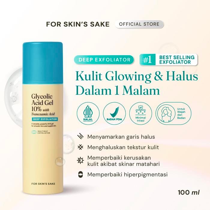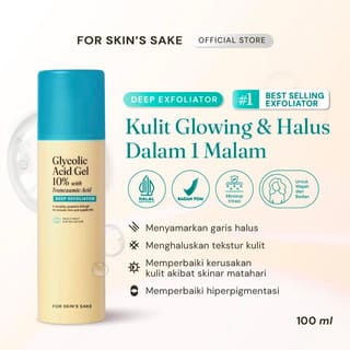 For Skin's Sake Glycolic Acid Gel 10% with Tranexamic Acid BPOM NO.: NA18220113129 NET 100ml **For SAMEDAY & INSTANT Delivery, the courier parking fee will be borne by the buyer of Rp.3000 AHA gel is versatile and powerful for smooth, firm, and supple skin. This exfoliator can be used as a toner, serum or wash-off mask. BENEFITS: Reduces fine lines and wrinkles Reduces hyperpigmentation for smoother-looking skin Makes the skin firm and supple INTENDED FOR: Skin Aging Acne-prone skin Dry skin Oily skin Combination Skin HOW TO USE: Apply 2-3 pumps all over the face, avoiding the eyes. Use 1-2 times per week for starters, and gradually increase use as needed. Use no more than once a day. INGREDIENTS: Aqua, Glycolic Acid, Propylene Glycol, Glycerin, Tranexamic acid, Biosaccharide Gum-1, Polyacrylate Crosspolymer-11, Phenoxyethanol, Saccharide Isomerate, Hydroxyethylcellulose, Allantoin, Bis-PEG-18 Methyl Ether Dimethyl Silane, Panthenol, Triethylene Glycol, Sodium Hyaluronate, Citric Acid, Sodium Citrate.