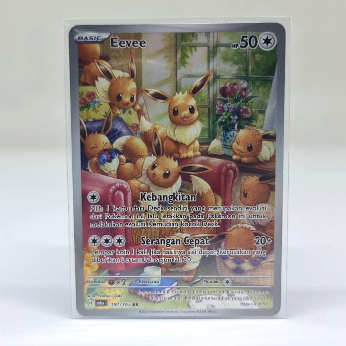 Pokemon TCG Indonesia Eevee SV6s 191/167 AR Free Sleeve + Top Loader Notes : 1. Please watch the video at the time of unboxing. 2. Complaints without video evidence of unboxing will not be served. 3. Damage / Loss due to the expedition party outside our responsibility, can be complained to the relevant expedition party. 4. The cards sold are never used to play. 5. Mint Card - Near Mint The condition of the mint and original card, fresh from the booster direct sleeve. 6. The packaging of the card delivery will use bubble wrap and an additional box to ensure the card is not damaged during shipping.