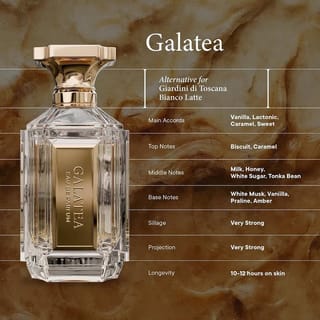 Velixir Galatea Eau de Parfum 100ml (Dupe of Giardini di Toscana Bianco Latte) Galatea – The Scent of an Unforgettable Night is a warm and inviting fragrance, immortalized with rich notes of vanilla, caramel, and praline. From the very beginning, a delicious and comforting aroma is created, composed of sweet biscuit and luscious caramel, evoking an indulgent and irresistible opening. The middle notes unfold into a creamy and dreamy blend of milk, golden honey, white sugar, and tonka bean, adding depth and warmth. The aroma ends with strong and long-lasting accords of white musk, vanilla, praline, and amber, leaving an unforgettable and seductive trail. Such a unique fragrance composition is perfect for those who embrace pleasure fully and leave a lasting presence. Top Notes: The first scent will be smelled after the perfume is sprayed on the skin ↳ Biscuit, Caramel Middle Notes: The second perfume scent that will be smelled after the top notes start to disappear ↳ Milk, Honey, White Sugar, Tonka Bean Base Notes: This scent will appear after the middle notes start to decrease and can last for 10-12 hours ↳ White Musk, Vanilla, Praline, Amber