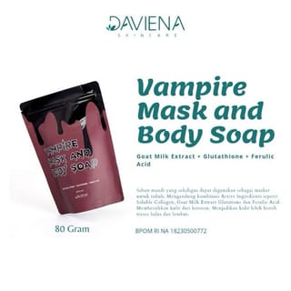 Vampire Mask And Body Soap | DAVIENA SKICARE Weight : 80 Grams BPOM : NA18230500772 Bath soap that can also be used as a mask for the body. Contains a combination of active ingredients such as Soluble Collagen, Goat Milk Extract, Glutathione and Ferulic Acid. To cleanse the skin from dirt, make the skin cleaner, feel smooth and soft. Rub the soap all over the body until it foams, let it sit for about 5-10 minutes, then clean and rinse with water until clean. ------------- BODY LOTION POWER MOONLIGHT BPOM Registration Number: NA18200106952 Weight :250 Grams Description . Specially designed to take care of your skin, this body lotion will provide incredible softness to your skin. The 7X Power Moonlight formula helps to retain moisture and make the skin softer and smoother.