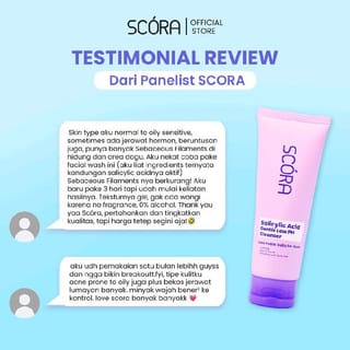SCORA Salicylic Acid Gentle Low pH Cleanser is a facial cleanser with a low pH content that helps cleanse acne-prone facial skin while helping to nourish and moisturize facial skin. No. BPOM : NA18231210316 Size: 100ml Benefits: Suitable for oily to acne prone skin Gentle Deep Cleansing Cleans excess dirt and oil all the way to the pores Helps reduce bacteria that have the potential to cause acne, bruises and blackheads Refreshes and hydrates the skin Soothing pH balance Minimal foam, soft on the skin Main Ingredients: - Salicylic Acid [0.5% Active] As an anti-bacterial for acne - Sodium PCA: Maintains skin pH and moisture for optimal hydration - Allantoin: Helps soothe and cool the skin - Ectoin: As a soothing agent that helps soothe the skin - Panthenol & Bisabolol: Helps maintain skin moisture - Urea: Helps improve hydration and lock in skin moisture How to Use: 1. Wet your face with water 2. Pour enough Salicylic Acid Gentle Low pH Cleanser into the palm of your hand 3. Lather and rub evenly over the entire face and neck. Avoid the eye and mouth area 4. Rinse with water thoroughly Suggested Use: - Can be used as part of your morning and evening routine. - For beginners or owners of sensitive skin, start with use 3 times a week. Gradually increase the frequency according to the skin's tolerance. Warning: For outdoor use only. Avoid direct contact with eyes. In case of contact, rinse with running water. Discontinue use if irritation or allergic reactions persist, and consult a physician if necessary. Always perform a patch test on the back of the ear area or the inside of the arm before use. Store in a cool place, away from direct sunlight, and out of reach of children. FULL INGREDIENTS: Aqua, Cocamidopropyl Betaine, Glycerin, Salicylic Acid, Acrylates Copolymer, Sodium Lauroyl Methylaminopropionate, Citric Acid, Allantoin, Sodium Benzoate, Potassium Hydroxide, Sodium PCA, Potassium Cocoyl Glycinate, Panthenol, Potassium Cocoate, Sodium Benzoate, Mannitol, Microcrystalline Cellulose, Sucrose, Zea Mays (Corn) Starch, Hydroxypropyl Methylcellulose, Mica, Titanium Dioxide, Ectoin.