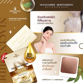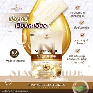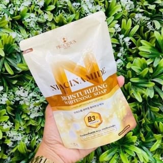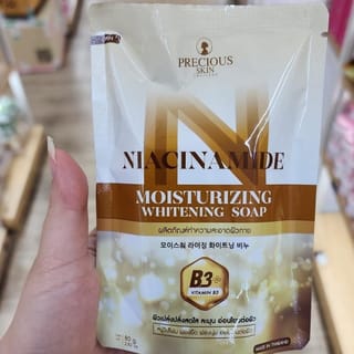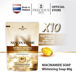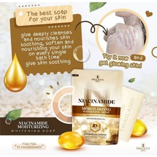 WELCOME TO PRECIOUS SKIN OFFICIAL SHOP gt; gt; gt; 100% ORIGINAL gt; gt; gt; BPOM VERIFIED Niacinamide Moisturizing Whitening Soap 80g. Niacinamide soap helps to gently remove dead skin cells with smoothly textured soap bubbles, creating bright, clean skin. Provides deep cleansing and nourishing skin that provides Vitamin B3 Niacinamide reduces melanin and gives brighter and smoother skin providing hydration to the skin. BENEFITS: - Brighten, prevent signs of aging, reduce acne. - Evens out skin pigmentation. - Improves skintone and fades dark spots. - Helps improve your skin to be clean, bright, soft and smooth. This soap also provides a unique spa scent for you to enjoy and relax while bathing, removing oil, dirt thoroughly and gently. For All Skin Types How to use: Use to cleanse the skin. Rub the soap to make a lather. Throughout the body and rinse with clean water every morning and evening. Safe for BUMIL and BUSUI does not cause dry skin not dependent on results in 2-4 mggu regular use permanent results NO SIDE EFFECTS INFO Product Authenthic : YES 100% Original Form : Soap Bar License : BPOM Indonesia No BPOM : NA49240500013 Brand : Precious Skin Thailand Product Date : 08/05/2024 Expiry Date : 08/05/2027 Size : 80g
