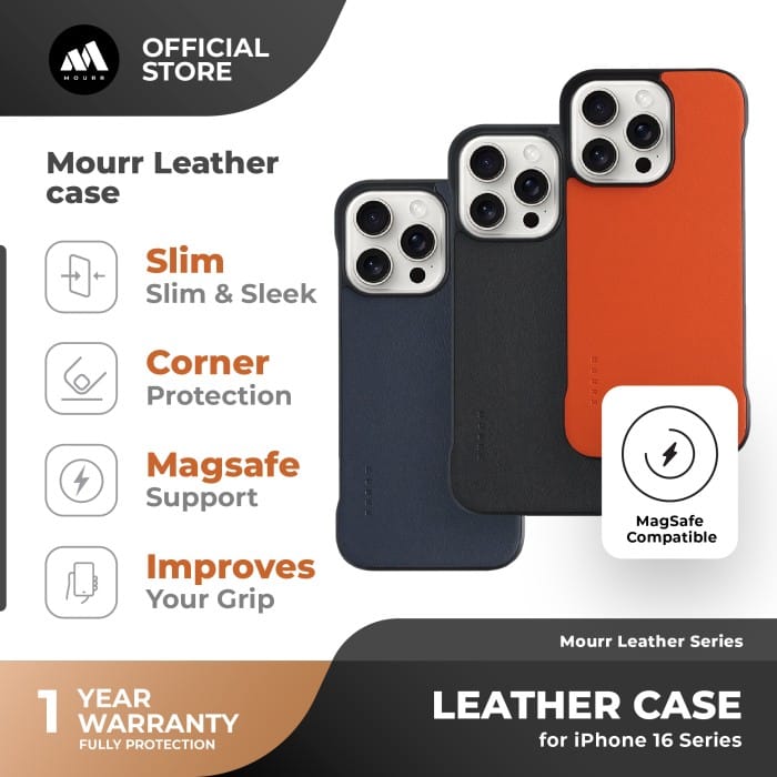 @About Mourr Mourr philosophy is "Giving you more" from the quality of product, one year warranty to ensure you've protected, and complete package for each product you buy from us. Every product and everything we do is strive to give you the best experience from buying our product. * Original by Mourr Original Definitely Ready | Definitely Original 100% | Fast Delivery | Packing is Guaranteed to Be Safe Indulge in luxury and superior protection with the Mourr Leather Case, designed exclusively for the iPhone 16. Crafted with precision and care, this case combines style and functionality seamlessly, ensuring your device stays safe in style. ## Feature: - Exquisite Leather: Our cases are meticulously handcrafted from premium leather, offering a soft touch and a distinctive look that ages beautifully. - Tailored for iPhone 16 Pro Series: Each case is precision-cut to perfectly fit the iPhone 16 Pro Series, allowing for easy access to all ports, buttons, and features. - All-Around Protection: A robust yet slim design provides 360-degree protection against drops, bumps, and scratches, keeping your device safe. - Magsafe Compatible: Effortlessly charge your iPhone 16 with wireless charging support, no need to remove the case. - Elegant Design Selection: Choose from a range of sophisticated colors and finishes to match your personal style, making a statement while safeguarding your investment. ## Warranty Mourr: 2 Years immediately replace new all kinds of damage such as broken or defective product. ## Box Contents: - Mourr Premium Case Specially designed for iPhone 16 Pro Max / 16 Pro / 16 Series Thank you for shopping with us