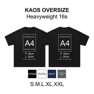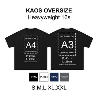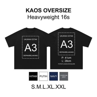 Price includes t-shirt+screen printing Digital DTF ( Direct To Film ) Machine Details: Material: Cotton Compact 16s Weight: 250gsm Pattern : Oversize semi boxy Advantages of Cotton Compact - Smooth & Soft, has a flatter thread surface and fewer bristles compared to hevyweight cotton fabric in general. -Breathable (Conducts air well, so it feels cool and comfortable when used. Ready T-Shirt Size: Length x Width (LxL) S: Length 66cm - Width 54cm. M: Length 68cm - Width 56cm. L: Length 70cm - Width 59cm. XL: Length 72cm - Width 61cm. XXL: Length 73cm - Width 62cm Size Tolerance 1cm Due to the production process - Design Format: JPG / PNG / PSD / AI / PDF For JPG/PNG files, you can directly send them via Chat. Example of order: Write the description of the color of the selected t-shirt, in the note column at the time of order Example: BLACK, Must include email/sender name, In the notes field, to make it easier to find the sent image file. - Give a description in each image sent via Email, Example of a picture A front B back To make it easier to know where the image is located. Note: After the order send the design file to our email. Try to send design files with high resolution, so that the print results are maximized. Prepare a file ready to print, in order to speed up the order process, we prioritize the customer that sends the file ready to print, because we don't edit the design or create a design. If you have any questions, you can directly chat with the admin via Tokopedia :) Fast Response