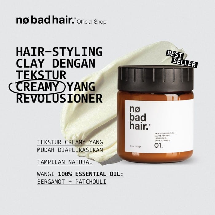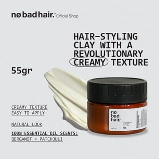 No Bad Hair No.1; Hair-styling creamy clay has a unique character that provides all-day durability and a natural look. This product is perfect for casual or formal looks. Product character of No Bad Hair No.1: - Creamy texture - Natural matte finish - High hold - Water soluble / easy to wash - Fragrance: Organic Bergamot & Patchouli - Net Contents: 100 ml. What's good? No Bad Hair No.1 is made with a number of natural ingredients in it; 1. Pure Essential Oil: The main fragrance uses bergamot and patchouli pure essential oil, which give it a soft and fresh fragrance. 2. Candelilla Wax: Rich in nutrients that are easily absorbed for the scalp and hair. 3. Shea Butter: Prevents hair from drying out, and protects hair from radiation exposure to sunlight. 4. Castor Oil: Helps hair grow stronger and thicker. How to wear & styling guide: 1. Take a small amount of No Bad Hair No.1 (+- about the size of an almond), smooth the product in the palm of your hand, apply it on completely dry hair. Make sure that the entire hair is coated from the front to the back. 2. Set your hair style with your fingers for a more natural result, or comb afterwards for a neater look. 3. Add a little product for more durability. 4. As a pre-styler: Apply No Bad Hair No.1 to damp hair and start the hair-drying process. As a result, your hair will look more naturally fluffy with a grip in it. Apply the product once again for more durability. Your Hair, Our Pleasure.