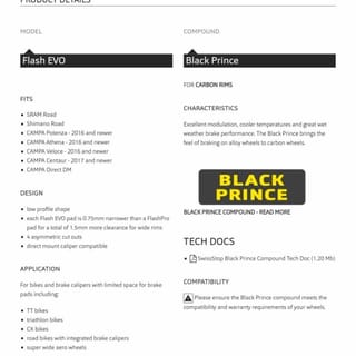 Original Brake Shoe Pad SWISS STOP Black Prince for Carbon Rims, U Brake Shimano/ SRAM. For 25mm wide rims, use the Pro version. EVO models for rims 28mm wide and above or for TT bikes with narrow brakepad space. For more clarity on the difference between Pro and Evo, you can see in figure 3. Packing only with plastic zip lock. Original goods but OEM (for direct manufacturers), not retail packaging, that's why it's cheaper. Contents consist of 4 brake pads for a pair of front and rear wheels Specifications: Heat Tolerance 8 Longevity 7 Modulation 9 Stopping Distance 51m (60 to 0 km/h; 100kg, 120 Newton Brake Force)