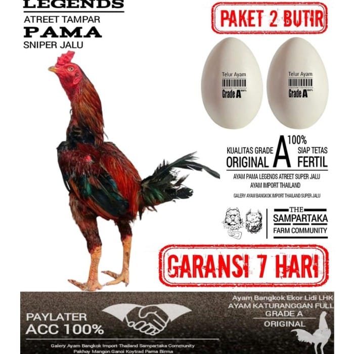 description chicken pama NINJA AND GOSTAN original NINJA AND GOSTAN CHICKEN EGGS FROM SAMPARTAKA MINI CONTEST ARENA PLAY PRO BIG COURT LITLE CHAMPION WINNER LAMPAM THE CAMPION COMMUNITY 7 DAYS WARRANTY according to the caption in the picture The warranty applies to eggs and purchases over 4 pieces or 2 packs Reading Culture The eggs are taken from Tahiland imported Pama chickens that have won the Big Game tournament Egg Filling Package of 2 Pama Ori Chicken GOSTAN original pama chicken specs : Gostan chicken is also a type of pama chicken that is quite interesting. Since its appearance, gostan chicken has been very liked and crazy by fight chicken hunters. Gostan chickens have a larger posture with a unique fighting style of backdrop athletes PAMA NINJA : Pama Ninja is the most popular pama chicken in Indonesia. Pama Ninja is the result of cross-breeding between mangon and Burmese females from Myanmar ACCURACY OF THE CHICKEN PUNCH OF PAMA NINJA GOSTAN : - the direction of the punch of the neck and head of the chicken - Accurate lower jaw - Entering at the front of the clock - Hit hard towards the neck and cache the chicken Characteristic characteristics of NINJA AND GOSTAN chicken : - The general size or weight of a pama chicken is only .2.3-2.9 kg. Another characteristic of the pama chicken is that it has round dry legs with yellow, blue, green and black colors or can be described with round dry legs and bright color patterns. Despite having a size and reinforcement that is not too large, pama chickens have dense feathers. But in terms of color, the color of the pama chicken is not very attractive. However, with a size that is not too large, it makes the pama chicken an agile fighting chicken. The fighting style of the pama chicken reaches 90% for the accuracy rate of shooting the opponent's head. In addition, the characteristic of the Pama chicken fighting style is by avoiding the opponent's attacks and swatting and ranging. Therefore, Ayam Pama often wins matches Pama chicken is also often used to beat Bangkok Pakhoy chickens and
