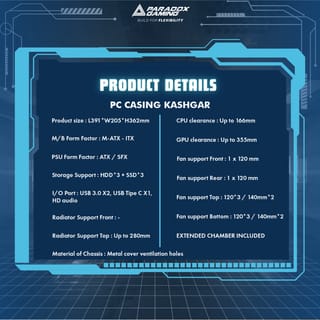 SPECIFICATION: CASE DIMENSION: 391*205*362mm PACKAGE DIMENSION: 391*205*362mm WEIGHT : 11 KG SIDE PANEL : Metal cover with ventilation holes M/B TYPE: MICRO-ATX, MINI ITX I/O: '2x USB 3.0 + 1x USB TYPE C +HD AUDIO SLOT EXPANSION: 5 LED STRIPS :- GPU MAX : 355mm(Psu at top),280mm(Psu move down when psu installed inverted or regular) CPU MAX: 166mm PSU : ATX/SFX DRIVE BAY : 3'5 : 3 2'5 : 3 5'25 : - SLOT BONUSES: FRONT :1*12CM(Front top when psu installed inverted ,Front bottom when psu installed regular) TOP : 3*12cm or 2*14cm (installed extended Chamber) and support 240mm/280mm liquid cooler,2*12cm or 1*14cm if without extended chamber,3*12cm or 2*14cm (Move psu down and VGA not longer than 284mm,and without installed Fan in the front) REAR : PREINSTALED 1 x 120mm argb fan SIDE : - BOTTOM : 3*12cm or 2*14cm (Move psu down and without installed Fan in the front),3*12cm or 2*14cm (Installed extended chabber) FOR CLAIMS, IT IS MANDATORY TO INCLUDE UNBOXING VIDEOS WITHOUT CROPPING PLEASE BE CAREFUL BEFORE PURCHASING, ITEMS THAT HAVE ALREADY BEEN PURCHASED CANNOT BE EXCHANGED OR RETURNED