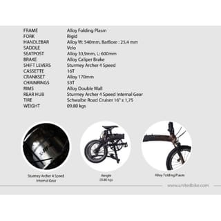 Frame : Alloy Folding Plasm Fork : Rigid Handlebars : Alloy 540 x 25.4 mm Seatpost : Alloy 33.9 x 600 mm Saddle : Velo Brake : Alloy Caliper Brake Shift Levers : Sturmey Archer 4 Speed Cassette : 16 T Crankset : Alloy 170mm Chainrings : 53 T Bottom Bracket : Rims : Alloy Double Wall Rear Hub : Sturmey Archer 4 Speed Internal Gear Tire : Schwalbe Road Cruiser 16 #34; x 1.75 #34; Weight : 9.8 Kg