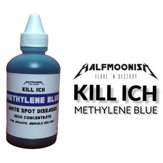 KILL ICH - METHYLENE BLUE WHITE SPOT DISEASES HIGH CONCENTRATE For Aquatic Animals use only *FOR ALL TYPES OF ORNAMENTAL FISH Effective in preventing and treating parasite and bacterial attacks. Indication: White Spot/Ich Fin Rot Fins Crepes Cotton Wool Ammonia/Nitrite Dosage: Prevention: 1 drop for 3-4L water. Treatment: 1 drop per Liter of water or 5ml for 25L of water Contains 100% Methylene Blue Netto. 100ml ORIGINAL by. HALFMOONISM