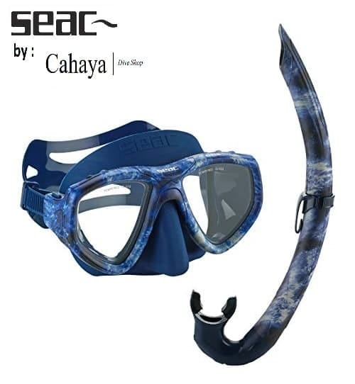 The Seac Mask and Snorkel are combined into 1 set, Available Colors As Pictured: Blue / Makaira Green / Pirana Chocolate / Kama Product Description Mask One Camaoflage ( Makaira, Pirana and Kama ) - Free Protective Hard Case included - Frame: Polycarbonate lined with special anti-abrasion camouflage obtained with WFT technology - Skirt: Liquid silicone with opaque anti-reflective finish - Lenses: Symmetrical in tempered glass Buckles: integrated into the frame - For Medium-Large Faces (110 lbs) The Seac Jet Snorkel is a simple rigid PVC snorkel with a prebent mouthpiece and no purge valves which make it idea for advanced snorkellers and in water rescue breaths.