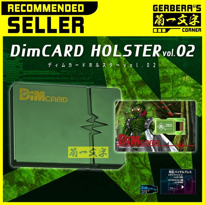 Dim Card DimCard Holster Vol 2 Primeval Warriors Vital Bracelet ORIGINAL BANDAI A special holder that can store a [Dimcard] that works with the wearable LCD toy series [Vital Bracelet] that allows you to develop and evolve your Digimon according to your heart rate and step count! Up to 5 Dimcards can be stored. The card part can be stored on the front side, and the Dim part can be stored on the back side. Includes a PRIMEVAL WARRIORS Dim card that records the evolution route