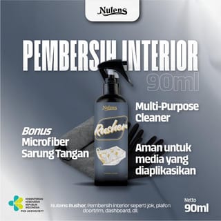 MINISTRY OF HEALTH NO : PKD 20310121877 ⠀⠀ The Nutens Rusher functions to clean the car's interior such as seats, ceiling, dashboard, door trim, etc. What are the advantages of Nutens Rusher? - Already have a Ministry of Health permit. - Can be used for all kinds of interior materials both leather, fabric, velvet, etc. - Safe for the media applied. - Does not emit an unpleasant odor after use. - Very easy and effective use. Every purchase of the Nutens Rusher will get: - 1 Nutens Rusher 225ml - 1 Microfiber Cloth - 2pcs Gloves How to use: 1. Use gloves and shake the bottle. 2. Spray the rusher liquid on the medium you want to clean. 3. Wait a few moments and then wipe the media with a microfiber cloth. *NOTE: If the stain is stubborn, it can be helped with a brush.
