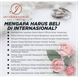 Welcome to INTERNATIONAL GOLD Official Store _____________________________ Product certification 1.Material: 18k Whte Gold Gold 2.Weight: -+ 6 grams 3.Content: 750-75% 4.Diamond: 0.05crat(1pcs)+0.01crat(22pcs)+0.005crat(10pcs) 5.Total diamonds: 0.32 CT 6.Collor: F 7. Clarity: VVS 8.Cutting: Excellent 9.Ring Size: Riquest 10.Color Choice: Gold, White Gold, Rose Gold It's time to look ellegan with original original items It is suitable for Gifts for the beloved __________________________________________ WARRANTY 1.Purchases will be included with the official store certificate and guaranteed 100 originals 2.Purchased goods can be resold to our store by direct Come to the store 3.Free laundry jewelry and chrom 4.Free 1x Resize 5.Free Name Graph ____________________________________ WHAT TO GET 1.Ordered goods 2.INVOICE/Proof of Purchase 3.Diamond Certificate 4.FREE Palladium Ring 5.Free Box Exsclusive ________________________________________ MANDATORY NOTE BEFORE PAYMENT 1.Make sure the address entered is correct and complete Street name,Rt,Rw,kec,kab,city,No home,office,benchmark address 2.Make sure the cellphone number provided is active can be contacted 3.If the address and Mobile Number provided are incomplete correctly Then we are not responsible for any problems in the Delivery 4.Our incoming orders are deemed AGREE & VALID and cannot be cancelled for any reason whatsoever 5.Delivery for Jabodetabek area must be Grab or Gojek 6.For Out of town Use ANTERAJA if covered 7.JNE is only for areas not covered by Anteraja WHEN RECEIVING & OPENING A PACKAGE THE BUYER IS REQUIRED TO DOCUMENT IN THE FORM OF A VIDEO OF DOCUMENTATION IN THE FORM OF A PHOTOIMAGE CANNOT BE CLAIMED Read the seller's notes for more info Accept custom Diamond gold orders with any model Operating hours contact Open daily 08.00-17.00 Close every week to3 Tlpn: 02187796171 ( Store ) WA (1) 081293679464 ( Admin ) WA (2) 081319455900 ( Admin )
