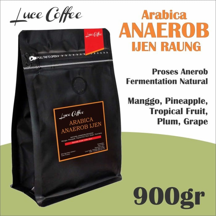 Luce Coffee, Ijen Raung Anaerobic Arabica Coffee 900gr - Seeds or Powder Name: Ijen Anaerobic Village: Sumberwringin, Bondowoso, East Java Type: Arabica Altitude: 1100-1200 Asl Process: Anaerobic Natural Fermentation Cupping Notes : Mango, Pineapple, Tropical Fruit, Plum, Grape Roasting Profile: Medium Roast and Medium Dark Grinding Level: Roasting Grains, Finely Grinded, Medium Grinded, Coarse Grinding