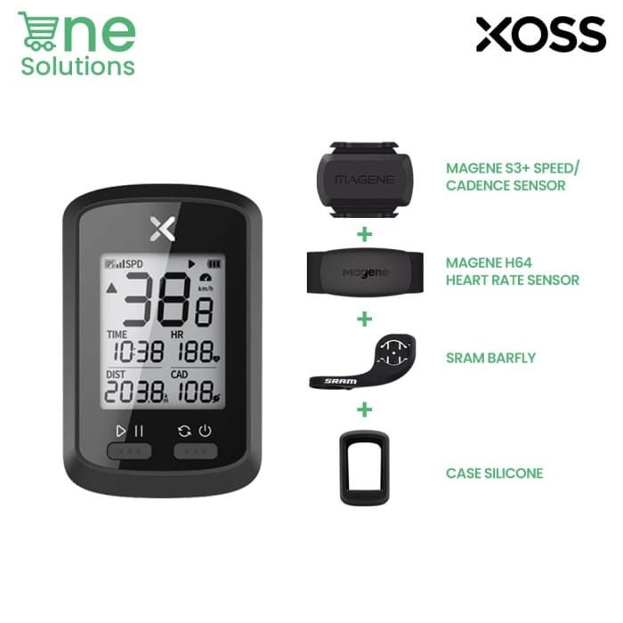 Packing list: 1 x XOSS G + 1 x Magene Heart Rate 1 x Magene S3+ as Cadence / Speed Sensor 1 x SRAM Barfly 1 x Silicone cover XOSS G+ network support from ANT+ and Bluetooth 5.0 If you are a cycling enthusiast or planning to join a sports club, then you should know, that it is important to track your training results with a speedometer to stay motivated. This is where the XOSS G+ comes in. XOSS G+ upgrades the bike computer with the latest breakthrough in GPS technology that tracks every moment accurately and precisely. Without the need for wires and magnets on wheels. It is easy to install and offers a seamless user experience. XOSS G+ supports third-party apps like Strava and Training Peaks, so you can easily share your rides with friends and fellow cycling enthusiasts. XOSS G+ also comes with its own companion app, providing professional data analysis and performance tracking. This data can be especially important for those preparing for cycling tours and competitions. With IPX7 technology, XOSS G+ is waterproof so you can enjoy a cycling experience in all weather conditions. Support : Cadence, Heart Rate Monitor and Speed Sensor sold separately