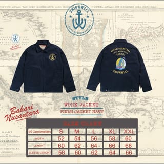 UNIONWELL LOCAL WISDOM WORK JACKET BAHARI COLLECTION PINISI WORK JACKET NAVY This Work Jacket Features : - Finest Twill 100% - Design Embroidery - Sateen Lining - Snap Button Pocket - Metal Zipper - Available 3 Pocket (One Inside) AVAILABLE FROM SIZE SMALL TO XXLARGE SIZE : Width Length Sleeve Length SMALL : 52 CM 60 CM 58 CM MEDIUM : 54 CM 62 CM 60 CM LARGE : 56 CM 64 CM 62 CM XLARGE : 58 CM 66 CM 64 CM XXLARGE : 60 CM 68 CM 66 CM MADE IN INDONESIA PLEASE DO ASK THE AVAILABILITY OF PRODUCT BEFORE PURCHASING THANK YOU FOR SHOPPING WITH US, STAY SAFE AND STAY WELL Notes : (PLEASE READ) 1. Please convey the message wisely and politely when you want to exchange the product if there is any damage/defect in the product received. 2. Every product you order at Unionwell gets a size change guarantee for 7 days after the item is received with a note as long as the product you want to exchange is available in stock. 3. We accept refunds/returns if the goods are not suitable or are defective in production on the condition that you MUST include a detailed unboxing video. 4 . Complaints or further information can be contacted directly through TOKOPEDIA live chat / contact our customer service. 5 . For return address : Jl. Panglima Polim No. 37B, Kel. Melawai Kec. Kebayoran Baru (MBLOC SPACE - TENANT UNIONWELL) South Jakarta 12160 6 . Orders using regular shipping will be delivered daily, delivery in the afternoon amp; night. 7 . Bookings using INSTANT and SAMEDAY will be delivered on the same day. For SAMEDAY the booking limit is 14:00 and INSTANT the order limit is 18:00. #Happyshooping