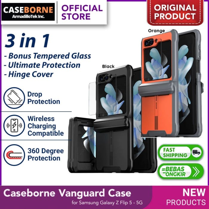 3 in 1 Packet ya.. It includes 360 Protection, Tempered Glass and the Pen Holder Advantages and Advantages of Shopping at GadgetLifestyle Official ? GadgetLifestyle Official is the Official Shopborne (OFFICIAL) in Indonesia so that the Warranty management will be much easier, faster and guaranteed 100% ORIGINAL ITEM, OFFICIAL WARRANTY up to 1 YEAR ( No Original Money Back) All goods will be packed safely so that they arrive at the best quality in delivery CASHBACK discounts and other attractive PROMO can only be obtained in our Store ========================================================= The Vanguard Series Galaxy Z Flip 5 Case encompasses a premium design & precise engineering to provide a case that meets double the Military Standards for drop & shock protection. * [Multi-Layer Protection] - Combination of TPU and Polycarbonate for protection from drops and scratches. * [Innovative Hinge Protection] - Semi-auto sliding hinge cover maximizes protection. * [Detailed Crafting and Engineering] - Open buttons for easy access and premium finish to enhance user experience. * [Advanced Foam Layer] - An extra layer of shock resistance, plus all-around protection on cameras and front screen with raised edges. * [Compatible with Samsung Galaxy Z Flip 5 Only] - We are on a mission to make your phone indestructible. Please make sure to double check your phone is the Z Flip 5! ## Contents in Boxes: * 1 x Z Flip 5 Caseborne Case * 2 x Tempered Glass for Front Cover * 2 x Glass Installation Kit Thank you for shopping with us