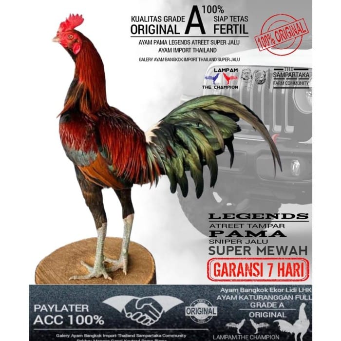 Description of Pama Chicken Eggs Super Complaint Super Papa Super Special Super Luxury IMPORTANT: Do not accept returns and returns in any form because buying means agreeing to the rules SPECS OF AYAM PAMA: Ayam pama is the result of the development of the latest fighting chicken with a posture that is felt to be very suitable Ayam pama is the result of crossbreeding between Burmese fighting chickens and Bangkok. The origin of the pama chicken is Thailand The pama chicken comes from Thailand. The country that produces the world's best fighting chicken is the area where the pama chicken was developed. Ayam pama itself has the same advantages as its predecessor but with the development of an even better style and posture. With the best breeding innovations, pama chickens are the most popular fighting chickens today. ADVANTAGES OF PAMA CHICKEN: The pama chicken that is able to overthrow its predecessor, the Burmese chicken, has unique head characteristics. The head of the pama chicken is small pointed. In addition, the size of the pama chicken beard is average standing and large. - Accurate punch to the neck and head reaches 90% - Dominant hit from the front/ nyawat/ mranggal/ atreet slap backward - jalu more accurate - agile and fast - smart and unique in fighting EGG CONDITION : - Eggs have been checked 10 times before being sent to the buyer - Eggs are in very good condition and ready to hatch - Only send eggs with good quality (no damaged and defective items are sent) - 7 days warranty (according to the picture description) Thank you for visiting, happy shopping