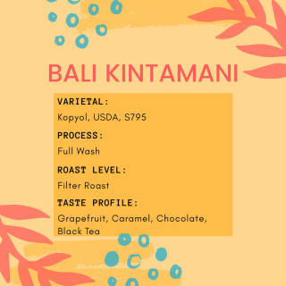 Bali Kintamani Grade 1 Coffee Beans 250 gr nett Roast Level: Filter Roast Profile: Grapefruit, Caramel, Chocolate, Black Tea Region: Kintamani, Bali Altitude: 1200- 1300 MASL Process: Full Wash Varietal: KOPYOL, USDA, S795 Suggested Brewing Method: - French Press - Pour Over - Aero Press - Filter Brewer - Cold Brew Packing : Flat-Bottom with Zipper