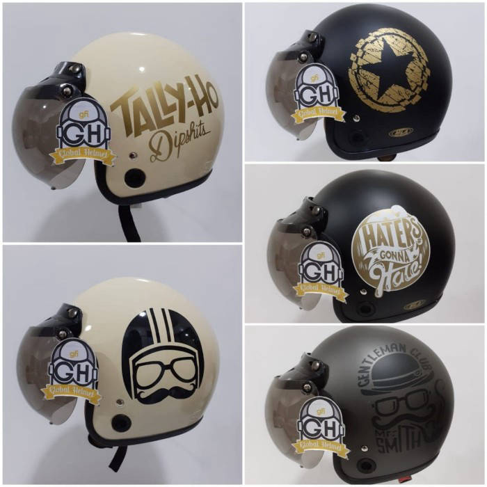 Confirm the motif and color before ordering WEIGHT LOSS 1 KG special FLASH SALE can only choose colors and for random motifs Specifications: Helmet Type: retro Glass : Smoke Glass Type: Convex Glass Type: retro Pinlock: no Tear off: No S: Can be removed Chin Hook : microlok Size : all size Packing : Bubble We recommend for the addition of cardboard packing Cardboard link : https://www.tokopedia.com/globalhelmet/kardus-extra-packing *by purchasing our products You agree to our store T&Cs