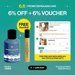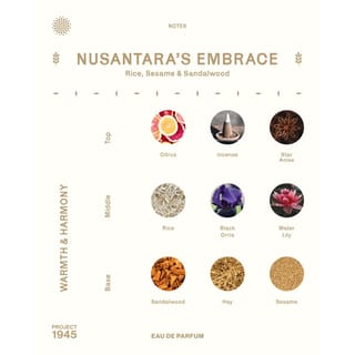 NUSANTARA #39; S EMBRACE EDP [100ML] BPOM: NA18230603506 The abundance of natural resources of the archipelago inspires us to continue to explore the fragrances of the archipelago so that it can be enjoyed by us and the world. Through Nusantara #39; s Embrace, an earthy, woody and soothing fragrance, we always strive to be a part of preserving the wealth of the archipelago. Combination of Rice, Sesame, Sandalwood in the Archipelago #39; s Embrace once again reminds us of the harmony of the archipelago in a warm and comfortable fragrance. Type: Eau De Parfum (EDP) Woody amp; Watery Top: Citrus, Incense, Star Anise Mid: Rice, Black Orris, Water Lily Base: Sesame, Sandalwood, Hay --------------------------------- SHIPPING *Shipping every day except Saturday, Sunday and red dates. *Shipped the same day if - Payment confirmation is made before 3pm (Monday-Friday) More than that will be delivered on the next *working day*. *Delivery is made from Jakarta, and the delivery duration is adjusted to the distance and punctuality policy of each delivery service. *If there are any problems, please contact the Project 1945 Team directly, and we are ready to help.