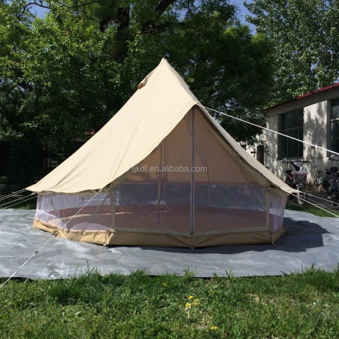JHMART Fireproof canvas glamping tent flame retardant We Provide A Wide Range Of Quality Goods - Pre-Order Items (6 - 10 Days) - Fast Delivery - Our hub to inquire about the availability of goods Type : Other Origin : CN(Origin) Place of Origin : Tianjin, China Model Number : T-KDF-005 Area : 500*300cm*60cm Fabric : polyester-cotton Outside Tent Waterproof Index : <1000 mm Bottom Waterproof Index : >3000 mm Building Type : Construction Based on Need Season : Four-season Tent Color : light beige Floor : 540gsm Ripstip PVC material : 285gsm cotton canvas Application : Glamping Bell Tent Size : 500x300x60cm Style : Round bell tent Logo : Customer Required MOQ : 100pcs Specification5m bell tentSize500x300x60cmTent body285gsm 100% natural cotton canvasTent floor540gsm ripstop PVC, harmlessPole32x1.2mm steel pole brass coatedMeshNo-see um B3/B1 meshRope5mm/6mm rope with reflectivePegTriangle peg or twist steel pegBagzipper bag or string bagProduct DescriptionProduct DetailsIt has a zipper aroung tent bottom, the sidewalls can be rolled up in the summer is cool. Mesh wallWe can supply bell tent with mesh wall, after sidewalls are rolled up, it can avoid insects flying into tent. Both canvas wall and mesh wall as its own zips.stove jack holeWe can sew stove jack hole on the tent if customer's need it. Stove jack hole can be added on the roof or on the wall, then the users can use stove inside tent. It will use fireproof webbing straps.hooksMetal hooks at the cornerof door yWe supply 3/4/5/6/7m bell tent3m bell tent4m bell tent5m bell tent6M bell tentSize:300x200x57cmSize:400x250x60cmSize:500x300x60cmSize:600x350x70cmpacking sie:85x26x26cmPacking size:95x29x29cmPacking 1005004417792542