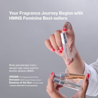 In each package, you'll get three 5 ml mini bottles of HMNS' best-selling feminine variant (about 33 sprays/one bottle) to help you find your signature scent :) • Orgsm, The Flagship Award Winner: It will take you into the world of the world's three best-selling flowers; Jasmine, the luxurious peony, and the rose. A modern interpretation of the flowers creates a bold and free scent, allowing you to exude confidence. • Essence of the Sun, The Best-Seller: Inspired by the warmth and energy of the Goddess of the Sun, EOS will take you to a blend of soothing jasmine sambac absolute and creamy vanilla, creating a scent that is both relaxing and warming. • Unrosed, HMNS Newest Feminine Scent: Revolutionary in its formula, Unrosed creates a rose scent without using actual roses. Through soliflore technology, this fragrance allows you to feel the fragrance of roses that are more elevated and characterful. You will also get a discount voucher of IDR 50,000 for your next purchase which is valid for 10 days after the product arrives. This is the first step we recommend before you decide to order a 100ml bottle of your favorite HMNS scent.