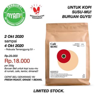 Thank you Toppers for supporting us and making us one of the NYAM products in tokped! With that, we will hold a special promo for you with a discounted price for our Temanggung robusta coffee beans that are freshly roasted every day! The discount is very attractive! limited time only! From the normal price of Rp.25,000 for a 250g size, now it is only Rp.18,000!!!! Only for the period from October 2, 2020 to October 4, 2020, guys! And also don't forget to support and vote for us as your choice! Thank you very much! #supportus #supportkopilokal #supportIndobevmo #banggabuatanIndonesia #kopiEsKopiSusu #KopiRobustaSusuGulaAren #RobustaItuEnak #kopiIndonesia! Vote us below! Every vote means something to us! https://tokopedia.link/D0ZcEDsjS9 https://tokopedia.link/D0ZcEDsjS9 Hurry up guys!! Recipe Link on our youtube channel! https://www.youtube.com/watch?v=QpQrtCWbm9w PREMIUM QUALITY, CONSISTENCY AND PRICE GUARANTEED. ROBUSTA ESPRESSO BLEND FOR COFFEE SHOP OR MAKE MILK ICED COFFEE, VIETNAMESE DRIP ETC. COFFEE BEANS ARE SORTED WELL TO ENSURE QUALITY. IT CAN'T BE THE SAME DAY DELIVERY BECAUSE IT HAS TO BE ROASTED FIRST. FASTEST PROCESSING 1 DAY BEFORE DELIVERY THE NEXT DAY. SO DELIVERY D+1 AFTER THE ORDER IS RECEIVED. TYPE: ROBUSTA ORIGIN: TEMANGGUNG PROCESS: HONEY MIXED VARIETAL ROAST DATE: FRESH FROM ORDER TASTING NOTES: SMOKEY, BOLD, NUTTY, LOW ACIDITY, CARAMELISED BROWN SUGAR. SUITABLE FOR COCONUT SUGAR, MILK COFFEE. HIGHLY RECOMMENDED. FOR GRIND SIZE, YOU CAN SEE THE GUIDE PICTURE OR: COARSE GRIND | COARSE - FOR FRENCH PRESS, COLD BREW. MEDIUM GRIND | MEDIUM - FOR AEROPRESS, V60, KALITA, DRIP, SYPHON. FINE GRIND | FINE - FOR MOKAPOT, TURKISH, FIRE STYLE BOAT.